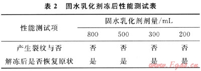 對固水乳化劑的保水性、冷凍后的質(zhì)密性、解凍后是否能恢復(fù)原來的膏狀體及其解凍時間進行了性能測試。