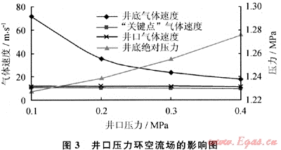 從井口壓力對環(huán)空流場的影響曲線(圖3)可以看到,井口壓力從0.1MPa增加到0.4MPa,井口、“關(guān)鍵點(diǎn)”、井底氣體速度分別減小75%、6.0%、3.8%,井底壓力增加3.99%,井口加載一定回壓后,上部井段環(huán)空流速明顯減小,削弱了夾雜固體顆粒的高速氣流對環(huán)空井壁和鉆具的沖蝕作用,而井口回壓的增加并不會明顯影響井底壓力。所以,通過在井口加載一定回壓,可實(shí)現(xiàn)對上部井段環(huán)空流場的改善。