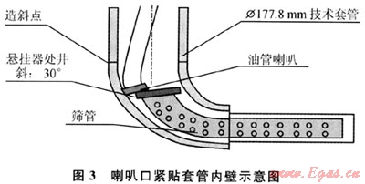 3) 目前尾管懸掛器座掛位置一般位于井斜30°左右處。因此,油管喇叭口在經(jīng)過該井段時其端面勢必緊貼套管內(nèi)壁,致使無法順利進(jìn)入懸掛器回接筒內(nèi)(圖3)。