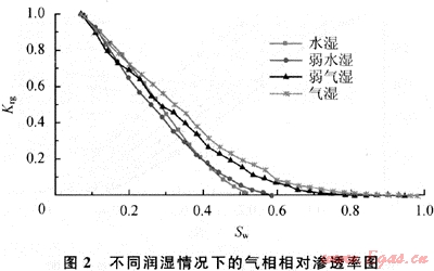 圖2給出了不同潤濕條件下的氣相相對(duì)滲透率曲線。在每一飽和度下,水濕巖樣的氣相相對(duì)滲透率總比氣濕巖樣的氣相相對(duì)滲透率低很多,這給出了一個(gè)可在油田應(yīng)用的潛在方法:對(duì)致密氣藏,改變近井地帶的潤濕性,使其由水濕變?yōu)闅鉂?,可以增加氣體的滲流能力,提高產(chǎn)量或注入量。值得注意的是,當(dāng)水飽和度大于0.4時(shí),氣體的相對(duì)滲透率按照水濕→弱水濕→弱氣濕→氣濕的順序依次增加;但當(dāng)水飽和度小于0.4時(shí),相對(duì)滲透率增加的次序性被打亂,在弱水濕情況下表現(xiàn)為最小。