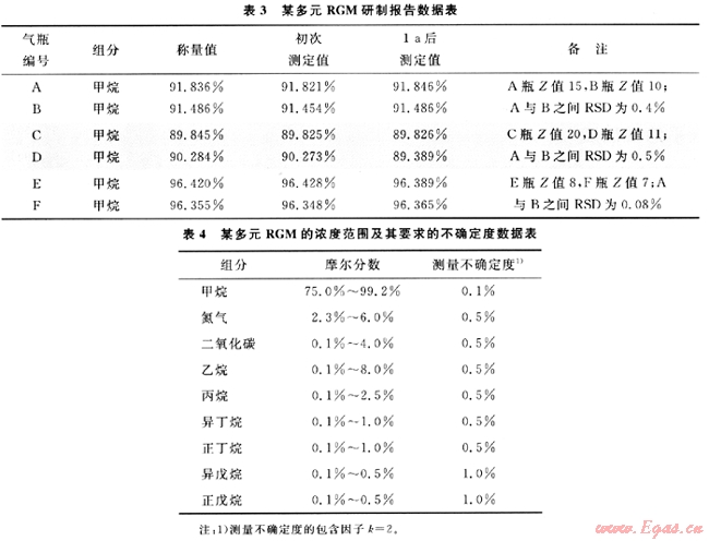 每種用稱量法制備的RGM的驗(yàn)證都可以利用其與可溯源標(biāo)準(zhǔn)的直接比較來實(shí)現(xiàn)。對(duì)于應(yīng)用于天然氣分析的多元RGM,驗(yàn)證過程應(yīng)按國(guó)家標(biāo)準(zhǔn)GB/T 10628“校準(zhǔn)混合氣組成的測(cè)定和校驗(yàn)一。比較法”的有關(guān)規(guī)定進(jìn)行,一般以氣相色譜儀為測(cè)量設(shè)備進(jìn)行測(cè)定,從而檢查各組分的測(cè)定值與其預(yù)先設(shè)定值(預(yù)賦值)在它們要求的不確定度范圍是否一致。