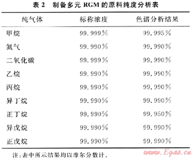 高純度起始組分(原料氣)中的雜質(zhì)分析是制備高準(zhǔn)確度RGM的另一個(gè)必須解決的關(guān)鍵技術(shù)。此類測(cè)定準(zhǔn)確度要求很高的原料氣純度分析研究工作不可能由生產(chǎn)廠家完成。根據(jù)GB/T 5274附錄A有關(guān)原料氣純度的論述表明,表2所示的原料氣純度數(shù)據(jù)在尚未作進(jìn)一步分析驗(yàn)證前,它們不能應(yīng)用于制備擴(kuò)展不確定度為0.5%(包括表中所列9個(gè)組分的)多元RGM的原料氣,甚至也不能應(yīng)用于制備擴(kuò)展不確定度為1%的多元RGM。