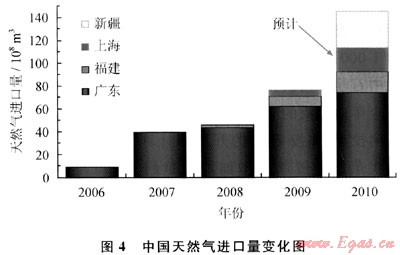 進口液化天然氣(LNG)正在幫助緩解因需求迅速上升給國內(nèi)市場供應(yīng)帶來的壓力。自2006年5月26日國內(nèi)第一船進口6×104t澳大利亞液化天然氣運抵深圳大鵬灣以來,國內(nèi)進口液化天然氣設(shè)施已發(fā)展到3座,分布在廣東深圳、福建莆田和上海洋山,規(guī)模分別為370×104t/a、260×104t/a和300×104t/a。2009年液化天然氣進口量已由2006年的69×104t猛增到553×104t(76×108m3)(圖4)。進口液化天然氣以用作發(fā)電和工業(yè)燃料為主,也有一部分進入城市天然氣管道,滿足民用燃氣需求。隨著上海洋山進口設(shè)施轉(zhuǎn)入正常運轉(zhuǎn),并保障上海世博會期間的燃氣供應(yīng),中海油3座進口設(shè)施2010年的進口量可能會輕易超過800×104t。今后兩三年內(nèi),當(dāng)中石油江蘇如東和遼寧大連以及中海油浙江寧波共3座在建進口設(shè)施建成投產(chǎn)時,液化天然氣年進口規(guī)模將由現(xiàn)在的930×104t擴大到1880×104t。中海油預(yù)計到2020年僅該公司就將擁有5000×104t/a進口液化天然氣接收能力。