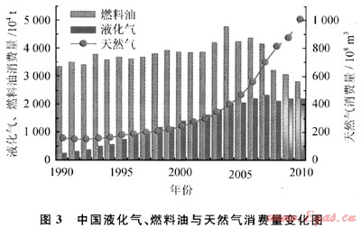 天然氣市場現(xiàn)正處于高速增長的時期。在西氣東輸項目完工并于2004年10月開始向華東地區(qū)供氣后的5年里,國內(nèi)天然氣消費量年均增幅達17%,2009年消費量已增加到874×108m3[6]。而在這之前,20世紀90年代10年里的年均增幅只有4.5%。2010年,國內(nèi)天然氣消費量估計將達到1050×108m3,到2020年預(yù)計將增長兩倍達到3000×108m3,受沖擊最大的是燃料油和液化氣,液化氣需求增長將受到嚴重阻礙(圖3)。