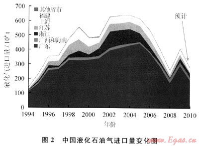 現(xiàn)有煉油廠也將適度增加加工量。預(yù)計2010年國內(nèi)原油加工量增長將超過10%,達到4.10×108t以上。液化氣產(chǎn)量可能會增加到2050×104t左右。今明兩年,國內(nèi)液化氣需求的任何增長都可能由國產(chǎn)氣增產(chǎn)來滿足,這可能使進口氣市場規(guī)模在2009年重新擴大之后再度縮減。