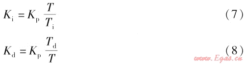 在上述離散化過(guò)程中,T必須足夠短才能保證采樣精度。為書寫方便,將e(fT)用e(f)表示,將式(4)、(5)代入式(2),化簡(jiǎn)后可得離散的PID表達(dá)式為: