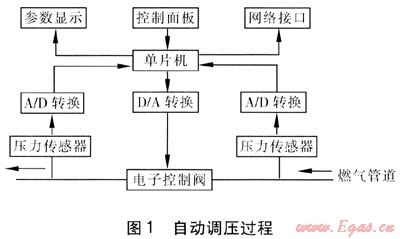 操作者通過(guò)控制中心遠(yuǎn)程或控制面板現(xiàn)場(chǎng)設(shè)定出口壓力值。在現(xiàn)場(chǎng)站點(diǎn)的入口和出口處均設(shè)有壓力傳感器,實(shí)時(shí)將入口、出口側(cè)的壓力信號(hào)經(jīng)模擬/數(shù)字信號(hào)(A/D)轉(zhuǎn)換器輸入單片機(jī),并可在液晶屏幕上實(shí)時(shí)顯示。當(dāng)出口壓力低于設(shè)定值時(shí),單片機(jī)發(fā)出的數(shù)字控制信號(hào)經(jīng)數(shù)字/模擬信號(hào)(D/A)轉(zhuǎn)換器轉(zhuǎn)換后輸出模擬電流信號(hào)至燃?xì)夥辣娮涌刂崎y,電子控制閥流量增大直至出口壓力達(dá)到設(shè)定值。當(dāng)出口壓力高于設(shè)定值時(shí),單片機(jī)發(fā)出控制信號(hào)經(jīng)數(shù)字/模擬信號(hào)(D/A)轉(zhuǎn)換器轉(zhuǎn)換后輸出模擬電流信號(hào)至燃?xì)夥辣娮涌刂崎y,電子控制閥流量減小直至出口壓力達(dá)到設(shè)定值。當(dāng)入口壓力過(guò)低或者過(guò)高、超出警戒值時(shí),系統(tǒng)可以在現(xiàn)場(chǎng)顯示報(bào)警,也可以通過(guò)網(wǎng)絡(luò)接口上報(bào)控制中心。系統(tǒng)可選用512 kb儲(chǔ)存器作為人機(jī)交互系統(tǒng)的外部?jī)?chǔ)存器,用來(lái)儲(chǔ)存設(shè)置參數(shù)等信息,這樣可以將壓力數(shù)據(jù)儲(chǔ)存并按要求進(jìn)行統(tǒng)計(jì)以供顯示或上傳調(diào)用。