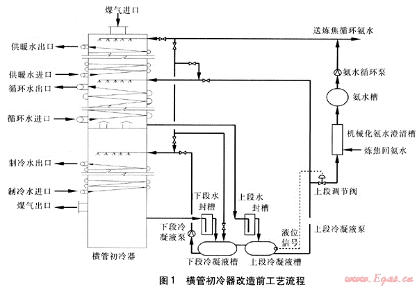5臺橫管初冷器并聯(lián)操作,煤氣從橫管初冷器上部進(jìn)入,為了保證初冷器對煤氣的冷卻效果,用水對煤氣分3段進(jìn)行冷卻。上段冬季進(jìn)水水溫為47℃,出水水溫為60℃,為合理利用熱量,將出水為附近居民供暖,回水再去上段冷卻煤氣,故該廠稱此水為供暖水。其余時(shí)間上段同中段一樣,用進(jìn)水水溫為32℃、出水水溫為45℃的循環(huán)水對煤氣進(jìn)行冷卻。下段用16℃制冷水將煤氣冷卻至18~22℃。為保證初冷器的冷卻除萘效果,在中、下段頂部連續(xù)噴灑焦油、氨水混合液,在上段頂部用熱氨水循環(huán)噴灑,以清除管壁上的焦油、萘等雜質(zhì)。初冷器上、中段排出的冷凝液經(jīng)水封槽流入上段冷凝液槽,用泵將其送入初冷器中段頂部循環(huán)噴灑,下段冷凝液槽內(nèi)多余的部分送到機(jī)械化氨水澄清槽。初冷器下段排出的冷凝液經(jīng)水封槽流入下段冷凝液槽,用泵將其送入初冷器下段頂部循環(huán)噴灑,下段冷凝液槽內(nèi)多余部分流入上段冷凝液槽。橫管初冷器改造前工藝流程見圖1。