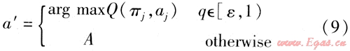 設當前狀態(tài)πj={a1,a2,a3,…,aj}下螞蟻k位于節(jié)點j,螞蟻將按照ε-貪婪規(guī)則確定在節(jié)點j′要選擇的行為a′,即以概率1-ε按貪婪策略選取當前狀態(tài)下最大Q值對應的行為。而以概率ε隨機選擇一個當前狀態(tài)下允許行為的表達式為: