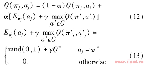 假設信息素模型(包括信息素更新規(guī)則、強化信號等)和狀態(tài)轉移規(guī)則均未知,則對所優(yōu)化問題的每一個節(jié)點j都賦以Q值(行為一狀態(tài)對),用Q值取代螞蟻信息素作為決策信息,通過對Q函數(shù)變化規(guī)律的學習不斷逼近最優(yōu)策略。