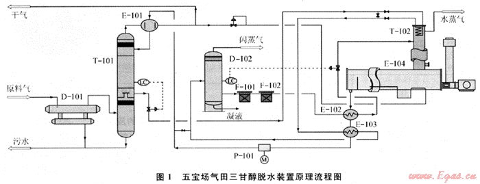 五寶場氣田三甘醇脫水裝置在設(shè)計中采用了先進的齒輪泵、高效的波紋板式換熱器,簡化了脫水工藝流程,降低了脫水裝置的能耗,減少了脫水裝置投資和運行成本。