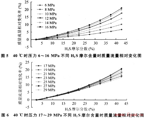 圖5、6分別給出了基于前述基準(zhǔn)條件,40℃時(shí)壓力為6~16MPa、17~29MPa和不同HzS摩爾含量時(shí)質(zhì)量流量變化情況。可見質(zhì)量流量變化主要受到H2S含量的影響,均隨H2S摩爾分?jǐn)?shù)增加而增加。相同H2S摩爾分?jǐn)?shù)時(shí),6~16MPa的質(zhì)量流量隨壓力增加的變化速度明顯加快,而在19~29MPa范圍時(shí)又隨壓力增加變化速度變慢。