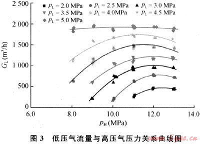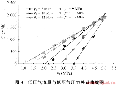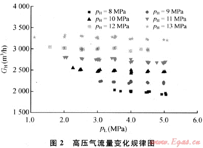從圖3中可以看出,低壓氣流量與高壓氣壓力為非單調(diào)關系,隨高壓氣壓力的增大而先增大后減小。由該圖可知,當高壓氣壓力(pH)為11~12MPa時,低壓氣流量的變化規(guī)律發(fā)生轉變,這與裝置設計工作壓力有關。