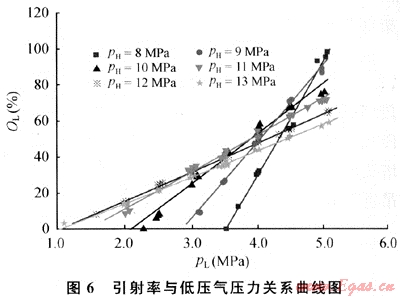 一般來說,隨著高壓氣壓力的增加,高壓氣流量增大,相應的引射量(低壓氣流量)也增大。但當聲。高于某特定值時,隨著高壓氣壓力的進一步增大,噴嘴出口的壓力升高,低壓氣的進氣壓力與噴嘴出口壓力的壓差減小,從而低壓流體的引射量減少。這表明在天然氣噴射裝置實際運行時,不能靠盲目提高高壓氣的進氣壓力來增大低壓氣流量。