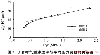 選取平湖地區(qū)某凝析氣藏J巖樣,利用上述實(shí)驗(yàn)方法,在溫度為25℃下用氮?dú)庾髁黧w介質(zhì),實(shí)測該巖樣氣體滲透率與平均壓力的倒數(shù)的關(guān)系,曲線見圖2中曲線1,作圖2中曲線1直線段的延長線(即圖2中曲線2)。由圖2可知,當(dāng)平均壓力倒數(shù)為0.41(平均壓力為0.245MPa,對(duì)應(yīng)的氣體流量為400mL/min)時(shí),曲線1所對(duì)應(yīng)的滲透率(J巖樣實(shí)
