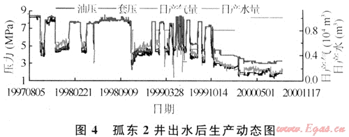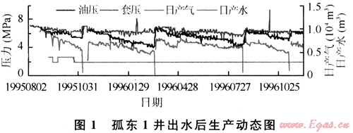對(duì)于孤東淺層氣藏來(lái)說(shuō),底水錐進(jìn)是一種常見的水侵方式。水錐初期對(duì)氣井產(chǎn)能的影響一般較微弱。隨著開采時(shí)間延長(zhǎng),水錐高度逐漸增加,水錐前沿到達(dá)近井地帶。此時(shí)射開層上部是氣體單相流,下部為氣水兩相流,近井地帶氣相相對(duì)滲透率值降低,氣井產(chǎn)能降低。開采后期水完全包圍近井地帶,氣井完全處于氣液兩相流狀態(tài),隨著近井地帶含水半徑和含水飽和度的增大,氣井產(chǎn)能急劇降低,嚴(yán)重情況下,氣井水淹封閉。典型井如孤東1井,圖1是該井出水后的生產(chǎn)動(dòng)態(tài)。氣井產(chǎn)水后,生產(chǎn)中套壓、油壓同時(shí)下降,關(guān)井后套壓油壓重新恢復(fù)。氣井產(chǎn)水后期套壓波動(dòng)的幅度逐漸增大,水錐加重了地層近井帶滲透狀況的劣化程度。
