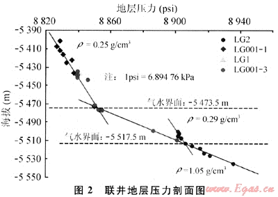 MDT在LG001-1井井深6171.19m測到1個壓力點(diǎn),測點(diǎn)處海拔-5573.78m,壓力61.2717MPa。將此海拔代入LG1井氣柱方程,計(jì)算壓力61.184MPa。用LG1井氣柱方程推算壓力比實(shí)測壓力低0.0877MPa,兩者相差較小,因此判定它們?yōu)橥粔毫ο到y(tǒng)。LG001-3井水層段測到了多點(diǎn)MDT壓力資料,與LG1、LG001-1、LG001-3井進(jìn)行多井壓力分析,分析結(jié)果表明,LG1、LG001-1、LG001-3并氣層與LG3井水層在縱向上呈較好的氣水分布規(guī)律,判定它們?yōu)橥粔毫ο到y(tǒng)。