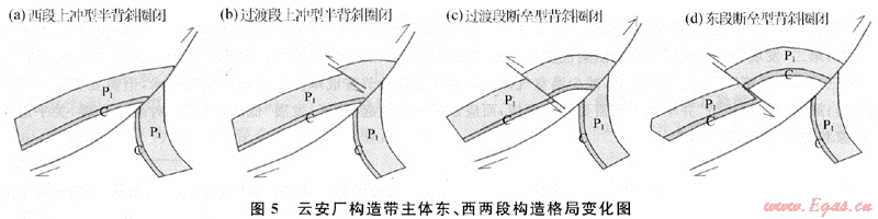從云安廠主體東、西兩段構(gòu)造格局分析結(jié)果看,西段構(gòu)造表現(xiàn)為上沖型半背斜圈閉(圖5-a),東段表現(xiàn)為斷壘型背斜圈閉(圖5-d)。在東、西兩段的鞍部接觸部位,可見明顯的構(gòu)造格局漸變,在地震02YST05測線部位,出現(xiàn)一條南傾逆斷層,該斷層在二疊系地層內(nèi)部發(fā)生斷裂(圖5-b),在02YST08測線部位,該條斷層斷距明顯增大,向上消失于嘉陵江,向下消失于志留系,與主斷層結(jié)合,形成了明顯的“斷壘”型構(gòu)造格局(圖5-c)。