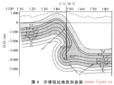 以云安10井為例,該井位于沙塘潛伏構(gòu)造西段近軸部,鉆探目的是了解潛伏構(gòu)造西高點(diǎn)的含流體性質(zhì),為該潛伏構(gòu)造的一口預(yù)探井。設(shè)計(jì)石炭系頂界海拔-4520m,預(yù)計(jì)井深5520m。實(shí)鉆鉆遇構(gòu)造陡帶。