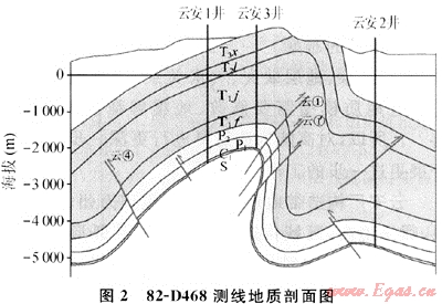 云安廠構(gòu)造中段,在云安1、2、3井實(shí)鉆剖面上,主體構(gòu)造上土城高點(diǎn)的云安3井鉆遇云1號(hào)斷層,云安2井在馮家灣潛伏構(gòu)造上。該剖面構(gòu)造形態(tài)表現(xiàn)為擠壓、抬升、上沖的構(gòu)造特征,與下盤構(gòu)造的組合關(guān)系體現(xiàn)為反“S”型構(gòu)造格局體系(圖2)。