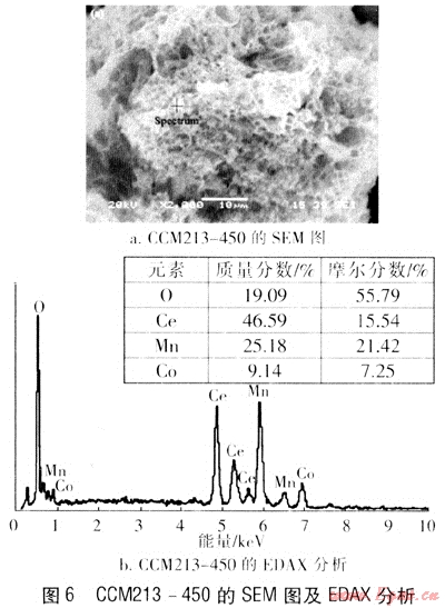 圖6為樣品CCM213-450的SEM圖及EDAX分析。由圖6a可見,催化劑表面呈現(xiàn)蜂窩狀多孔結(jié)構(gòu),這種結(jié)構(gòu)的物質(zhì)可以有很大的比表面積及孔隙率。該多孔結(jié)構(gòu)增加了樣品的比表面積,也有利于催化反應(yīng)中吸附及氧化過程的進行。但由圖6a可見,表面孔徑分布不均,可能與焙燒過程中升溫速率過快有關(guān)。圖6b為樣品的EDAX分析,Ce、Co、Mn、O這4種元素的物質(zhì)的量比基本滿足了2:1:3:7.5的關(guān)系。