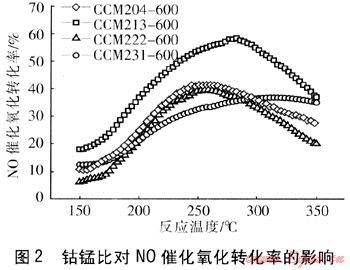 圖2考察了鈷錳比(此處指鈷錳物質(zhì)的量的比,簡稱為鈷錳比)對NO催化氧化轉(zhuǎn)化率的影響。由圖2可知,當Ce、Co、Mn物質(zhì)的量的比為2:1:3,反應(yīng)溫度為282℃時,催化氧化轉(zhuǎn)化率最高,達到58%;其他3個樣品的轉(zhuǎn)化率則相對較低。隨著錳含量的增加,催化劑的最高催化活性也有所增強,但繼續(xù)增加錳而減少鉆時,催化劑的催化氧化活性在一定程度上又降低,表明了鈷錳具有協(xié)同效應(yīng),且1:3為該效應(yīng)的最佳比例。值得注意的是,當Ce、Co、Mn物質(zhì)的量的比為2:3:1時,NO催化氧化轉(zhuǎn)化率隨溫度升高后下降較慢,表現(xiàn)出該催化劑具有一定的溫度適應(yīng)性。
