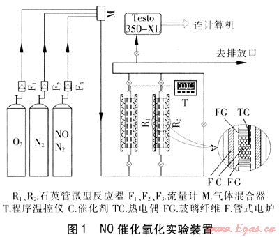 目前,NOx的主要來源為電廠、供熱鍋爐煙氣及汽車尾氣,且90%~95%為NO[1、2]。應(yīng)用于NOx脫除的各類方法包括:選擇性催化還原法(SCR)、連續(xù)再生捕集(CRT)、NOx儲存與還原(NSR)及濕法脫硝等,這些方法的共同點為在NOx脫除時NO2比NO具有更高的活性[3~5]。因此,如能將NO選擇性催化氧化為NO2,對于各類脫氮方法都將是一項重要的貢獻。根據(jù)NO與O2的化學反應(yīng)方程及反應(yīng)機理[6]可知,該反應(yīng)在熱力學上是可行的,但在常溫下,由于NO的弱極性及化學性質(zhì)的穩(wěn)定性,它們的反應(yīng)速度非常緩慢。NO選擇性催化氧化過程是指在催化劑及一定的反應(yīng)溫度下,將NO催化氧化為NO2,然后根據(jù)不同的脫除方法選擇不同的操作方式。如濕法脫硝過程,當氧化度提高到50%~60%時,液相吸收劑(如腐植酸鈉、氨水及Na2CO3)對NOx將取得最佳吸收效率[2]。
