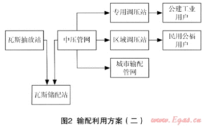 大中型煤礦瓦斯抽采一般分高低濃度兩套抽放系統(tǒng),這樣為高低濃度瓦斯的利用提供了有利條件。其中35%~45%高濃度瓦斯可以供應(yīng)礦區(qū)的民用、營(yíng)業(yè)福利炊事、洗浴爐、燃?xì)忮仩t、熱風(fēng)爐、工業(yè)爐窯等的自用氣,同時(shí)將大量的剩余瓦斯接入城鎮(zhèn)儲(chǔ)配、輸配系統(tǒng),供應(yīng)城市各類燃?xì)庥脩粲脷?。輸配利用方案?jiàn)圖2。