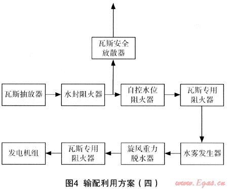 低濃度抽采系統(tǒng)安全性分析:低濃度瓦斯氣的抽采利用水環(huán)式真空泵的負(fù)壓進(jìn)行,系統(tǒng)隨著壓力的下降爆炸上限下降,在負(fù)壓下運(yùn)行大大提高了抽采系統(tǒng)的安全性。水環(huán)式真空泵在輸送瓦斯的同時(shí)加入了霧狀的水分,加大了瓦斯氣的濕度,保證了該輸送環(huán)節(jié)的安全性。輸配利用方案見(jiàn)圖4。