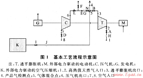 蘊含有大量壓力能的高壓天然氣,大多數(shù)情況下需要在調(diào)壓站通過調(diào)壓設(shè)備進(jìn)行降壓處理。采用這種傳統(tǒng)的調(diào)壓方式,天然氣自身蘊含的壓力能在調(diào)壓設(shè)備降壓過程中被白白損失掉了,而且降壓過程還產(chǎn)生大量的噪音;另外,由于設(shè)備急劇降溫,還將有可能對調(diào)壓及管道設(shè)備運行造成威脅甚至損害。同時,這種傳統(tǒng)調(diào)壓方式并不能調(diào)配調(diào)壓站出站天然氣的熱值和燃燒特性參數(shù),各個調(diào)壓站的出站天然氣熱值不一致,燃燒特性參數(shù)也難以完全滿足管網(wǎng)要求。因此,需要實施一種新技術(shù),能夠確保各個調(diào)壓站出站天然氣的熱值和燃燒特性滿足用戶需求。
