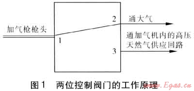 天然氣汽車是由車載氣瓶內(nèi)的高壓天然氣經(jīng)過調(diào)壓設備減壓后進入發(fā)動機,與空氣混合后燃燒產(chǎn)生動力,驅(qū)動行駛,而車載氣瓶內(nèi)的高壓天然氣是通過汽車加氣站的加氣槍進行加注[1~3]。加氣槍的核心部件是一個兩位控制閥門,用于進行具體的加氣操作,該閥門的工作原理見圖1。