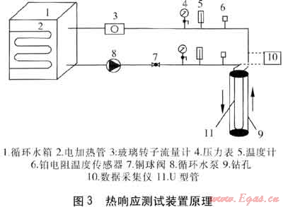 熱響應(yīng)測試原理是對地埋管中的循環(huán)水進(jìn)行持續(xù)的恒熱流加熱,根據(jù)U型管進(jìn)出口水溫隨時(shí)間的變化規(guī)律計(jì)算出巖土的熱物性參數(shù)。