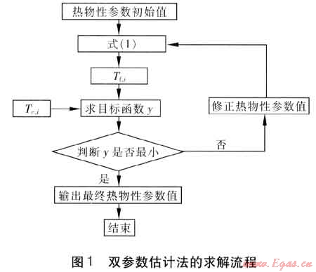 最小時(shí),此時(shí)的熱物性參數(shù)即為所求結(jié)果。雙參數(shù)估計(jì)法的求解流程見圖1。