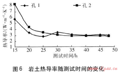 ③ 在實(shí)際測試中,采用線熱源模型進(jìn)行熱響應(yīng)測試,測試至少要進(jìn)行45h才能計(jì)算得到穩(wěn)定合理的巖土熱導(dǎo)率。