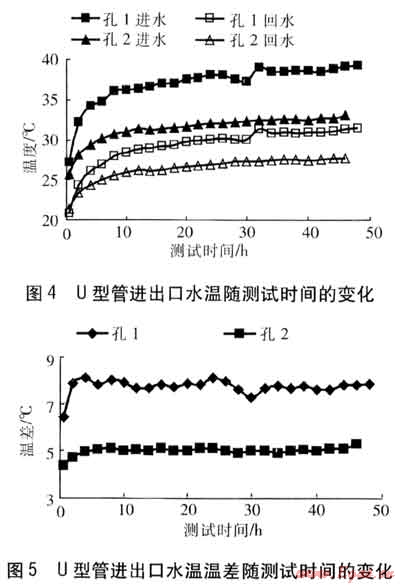 孔1、2進(jìn)出口水溫、進(jìn)出口水溫溫差隨測試時(shí)間的變化分別見圖4、5。
