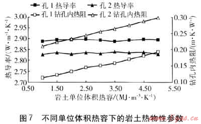 ④ 基于線熱源模型和雙參數(shù)估計(jì)法,巖土的單位體積熱容對熱導(dǎo)率幾乎沒有影響,對鉆孔內(nèi)熱阻有一定影響。