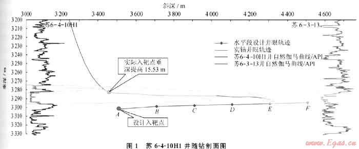如果設計靶點低于實際目標層,在有效地層厚度范圍內井斜角達不到工程入靶技術要求,則存在鉆刻目標層、填井重鉆風險。典型井蘇6-4-10H1,設計靶點在預測目標層以下15.53m,發(fā)現(xiàn)后及時上調入靶點,最終使該井成功入靶(圖1)。