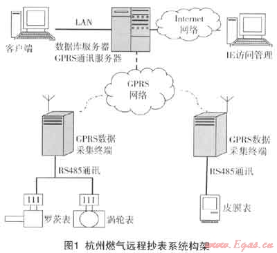 杭州燃?xì)膺h(yuǎn)程抄表系統(tǒng)由計(jì)量表具、GRPS無線網(wǎng)絡(luò)、GPRS數(shù)據(jù)采集終端、通訊服務(wù)器、數(shù)據(jù)庫(kù)服務(wù)器及客戶端組成。整個(gè)系統(tǒng)可分為數(shù)據(jù)采集層、無線網(wǎng)絡(luò)層和數(shù)據(jù)管理層3個(gè)層次。其系統(tǒng)架構(gòu)如下: