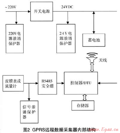 GPRS遠(yuǎn)傳數(shù)據(jù)采集器是遠(yuǎn)程抄表系統(tǒng)的重要設(shè)備,數(shù)據(jù)采集器具有RS485/232接口,通信速率為300~115200bps,通信協(xié)議采用MODBUS RTU/ASCⅡ工業(yè)通信協(xié)議,內(nèi)部供電一般選擇24VDC。一只數(shù)據(jù)采集終端(DTU)實(shí)際應(yīng)用中一般接1-3只燃?xì)獗怼?biāo)準(zhǔn)GPRS遠(yuǎn)程數(shù)據(jù)采集器內(nèi)部結(jié)構(gòu)如下: