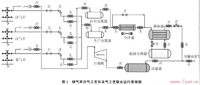 上游天然氣在分輸站調(diào)壓、計(jì)量后輸至儲(chǔ)氣庫(kù)集注站。進(jìn)站天然氣經(jīng)過(guò)濾器除去粉塵和雜質(zhì),經(jīng)壓縮機(jī)組增壓至13.O0~30.OOMPa,冷卻至溫度低于70℃后通過(guò)注氣匯管輸至井場(chǎng)注氣閥組,單井計(jì)量后再注入儲(chǔ)氣庫(kù)氣藏[1]。