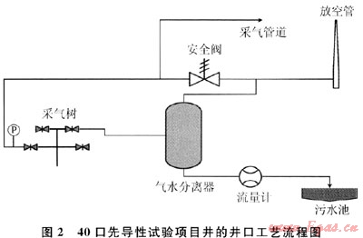 40口先導(dǎo)性試驗項目井的井口流程中,煤層氣從井口套管中產(chǎn)出,然后進(jìn)入采氣管道,往閥組匯集。采氣管道前裝有安全閥,采氣管道壓力達(dá)到0.4MPa后,安全閥跳起,超壓氣體進(jìn)入放空管放空,避免系統(tǒng)超壓而產(chǎn)生危險。產(chǎn)出水從油管中產(chǎn)出,首先經(jīng)過氣水分離器進(jìn)行分離,分離出來的氣體由放空管進(jìn)行放空,分離后產(chǎn)出水進(jìn)行流量計量,然后排放到井口污水池。該井口工藝流程如圖2所示。