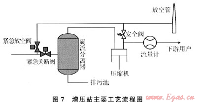 在分離器的入口管道上設(shè)有緊急關(guān)斷閥和緊急放空閥,當(dāng)出現(xiàn)事故時立即關(guān)閉緊急關(guān)斷閥,同時打開緊急放空閥,使煤層氣進(jìn)入放空系統(tǒng)。當(dāng)壓縮機(jī)的進(jìn)氣量不能滿足壓縮機(jī)進(jìn)氣要求時,打開壓縮機(jī)的旁通閥,使壓縮機(jī)的出口煤層氣回流至壓縮機(jī)入口,進(jìn)行流量調(diào)節(jié)。壓縮機(jī)組的進(jìn)口匯管設(shè)有調(diào)壓放空系統(tǒng),壓縮機(jī)事故停機(jī)時,導(dǎo)致壓縮機(jī)入口壓力增高,通過調(diào)壓放空閥將超壓部分的煤層氣及時放空去放空系統(tǒng),從而保持其他壓縮機(jī)組的正常運行。該增壓站主要工藝流程如圖7所示。