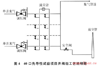 40口先導(dǎo)性試驗項目井中,氣體進(jìn)入閥組后,首先經(jīng)過調(diào)壓閥調(diào)壓,壓力調(diào)整為0.2MPa,單井產(chǎn)氣可利用閥門倒換流程,進(jìn)行單井產(chǎn)氣輪換計量。所有氣體匯集到生產(chǎn)匯管后進(jìn)入集氣管道,輸至集氣站。在生產(chǎn)匯管上安裝有安全閥,當(dāng)壓力超過0.4MPa時,安全閥自動跳起。閥組中單井流量數(shù)據(jù)通過光纜傳輸至監(jiān)控中心。該工藝流程如圖4所示。
