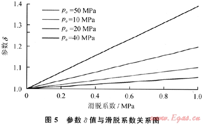 由圖5及式(10)可以看出:氣井無阻流量比值與滑脫系數(shù)(b)呈線性關(guān)系;滑脫系數(shù)(6)越大,供給邊界壓力(pe)越小,參數(shù)δ越大,氣體滑脫對氣井產(chǎn)氣能力影響越大;當(dāng)邊界壓力(pe)較低時(如pe≤5MPa),參數(shù)δ受滑脫系數(shù)(b)影響較大,氣體滑脫效應(yīng)對氣井產(chǎn)氣能力影響較大;而當(dāng)邊界壓力(pe)較大時(如pe≥10MPa),參數(shù)δ受滑脫系數(shù)(b)影響不大,氣體滑脫效應(yīng)對氣井產(chǎn)氣能力影響較小,這一計算結(jié)果與室內(nèi)巖心滲流實驗結(jié)果一致。