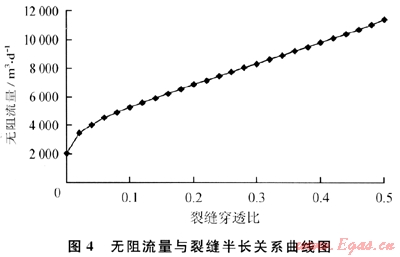 南式(9)的產(chǎn)能公式計算得到不同裂縫穿透比(Lf/re)對應(yīng)的氣井無阻流量如圖4所示,其中選用的原始儲層壓力為10MPa,即邊界壓力(pe)為10MPa,滑脫系數(shù)(b)為0.6MPa作為產(chǎn)能計算的參數(shù)值。