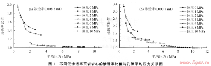 兩塊實驗巖樣取自頁巖氣層,滲透率分別為0.0085mD和0.0007mD。實驗過程中通過增加巖樣出口的回壓來模擬不同儲層孔隙壓力條件下氣體的滲流特征,回壓由初始的0.1MPa逐次增加到1MPa、2MPa、4MPa、6MPa、8MPa和10MPa,實驗過程中計算并繪制不同回壓狀態(tài)下對應(yīng)的氣體滲流特征曲線 (圖1)。可以看出:在低孔隙壓力(小于1MPa)條件下,氣體在巖樣中的滑脫效應(yīng)顯著;隨著孔隙壓力增加,氣體在巖樣中的滑脫效應(yīng)明顯減弱,當(dāng)孔隙壓力達(dá)到6MPa時,氣體滑脫效應(yīng)引起的滲透率增加值已經(jīng)不足5%;當(dāng)孔隙壓力繼續(xù)增加到8MPa以上時,氣體滑脫效應(yīng)引起的滲透率增加值已經(jīng)小于1%,可見儲層孔隙壓力大小直接決定了氣體滲流過程中滑脫效應(yīng)的強弱,如果儲層孔隙壓力大于1OMPa,那么頁巖氣藏開發(fā)過程中就沒有必要考慮滑脫效應(yīng)對于氣井產(chǎn)能和生產(chǎn)壓力的影響。換算到地層條件下就是如果氣藏壓力系數(shù)等于1,那么深度大于1000m的氣藏開發(fā)就可以不必考慮滑脫效應(yīng)的影響;如果氣藏壓力系數(shù)等于0.5,那么深度大于2000m的氣藏開發(fā)就不受滑脫效應(yīng)的影響,但是對于1000m的氣藏,滑脫效應(yīng)對于氣藏的開發(fā)效果有一定的影響,這種影響對于產(chǎn)能極低的頁巖氣藏來講是不可忽視的。