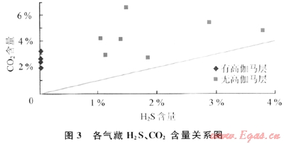 硫酸鹽熱化學還原反應的一個重要特征就是隨天然氣中H2S含量增高,CO2的含量也相應增高,且C02的含量高于H2S含量[7~8]。這一反應要產生H2S或HS-,這些產物溶于水變成為氫硫酸,氫硫酸在碳酸鹽巖儲層中與巖石孔壁反應產生溶蝕作用,造成儲層溶蝕孔洞發(fā)育,釋放的C02造成天然氣中C02含量高于H2S含量。該區(qū)各氣藏正好具有C02含量高于H2S含量的特征(圖3)。另外,在高H2S含量的Sam-53-1井巖心觀察和薄片分析表明,儲層內溶蝕孔洞發(fā)育,而H2S含量低的構造內,溶蝕孔洞不發(fā)育,這些均說明該區(qū)H2S的確為硫酸鹽熱化學還原反應產生。