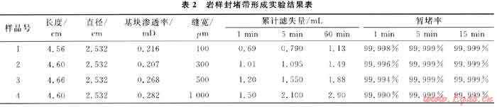 1) 實驗過程:①同本文2.2.1中①~③;②在不同流壓下用地層水反向測定巖樣濾失量,并計量出各流壓點上10min內(nèi)的累計濾失體積,計算此時的巖樣滲透率Ki及封堵帶暫堵率Zd=(Kw-Ki)/Kw×100%。若濾失量突然增大,說明封堵帶已經(jīng)被破壞,即可終止實驗,此時的壓差為封堵帶所能承受的最大強度值。