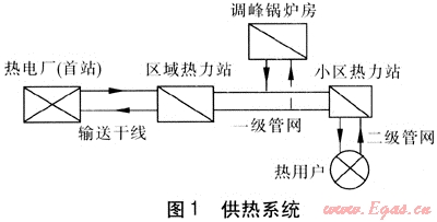 熱源為熱電廠,位于郊區(qū),供熱能力為518MW,熱源出口管道規(guī)格為DN 1000mm。由熱電廠向市區(qū)供熱,輸送干線長度達(dá)到13.6km,且管道通過地區(qū)地形復(fù)雜,最大高差達(dá)到100m以上。為保證熱網(wǎng)安全穩(wěn)定運(yùn)行,提高供熱介質(zhì)的溫度,降低輸送能耗,將熱網(wǎng)分為三級,供熱系統(tǒng)見圖1。輸送干線設(shè)計(jì)供回水溫度為130、70℃,一級管網(wǎng)設(shè)計(jì)供回水溫度為120、65℃,二級管網(wǎng)設(shè)計(jì)供回水溫度為85、60℃。供熱輸送干線距離長、管徑大、壓力、溫度較高,對可靠性要求較高。因此,在方案設(shè)計(jì)上,除了靜態(tài)水力分析合理可行外,還應(yīng)進(jìn)行動(dòng)態(tài)水力分析,避免出現(xiàn)重大事故。