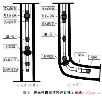 針對(duì)氣田硫化氫分壓高、生產(chǎn)井段長(zhǎng)及儲(chǔ)層非均質(zhì)性強(qiáng)的特點(diǎn),模擬普光氣田的工況條件,進(jìn)行不同材質(zhì)腐蝕評(píng)價(jià)實(shí)驗(yàn),優(yōu)化設(shè)計(jì)配套了生產(chǎn)完井一體化管柱(圖3),進(jìn)行雙向雙效、多級(jí)壓力延時(shí)起爆技術(shù)攻關(guān),開(kāi)展抗硫耐溫酸液體系、多級(jí)注入+閉合酸壓及暫堵工藝研究,有效地改造了Ⅱ、Ⅲ類(lèi)儲(chǔ)層,提高了氣藏的動(dòng)用程度和單井產(chǎn)能[8]
